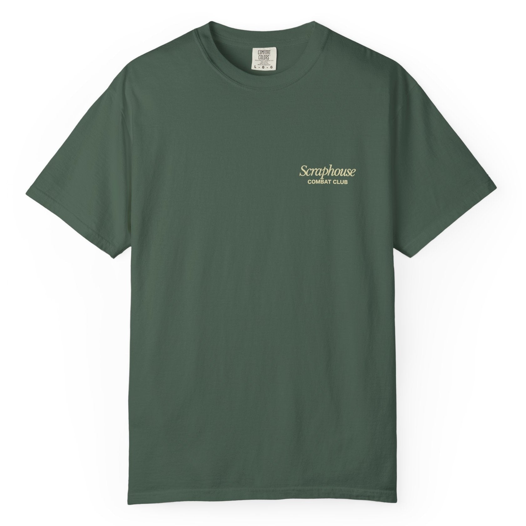 Cream print on Spruce Green heavy cotton tee.