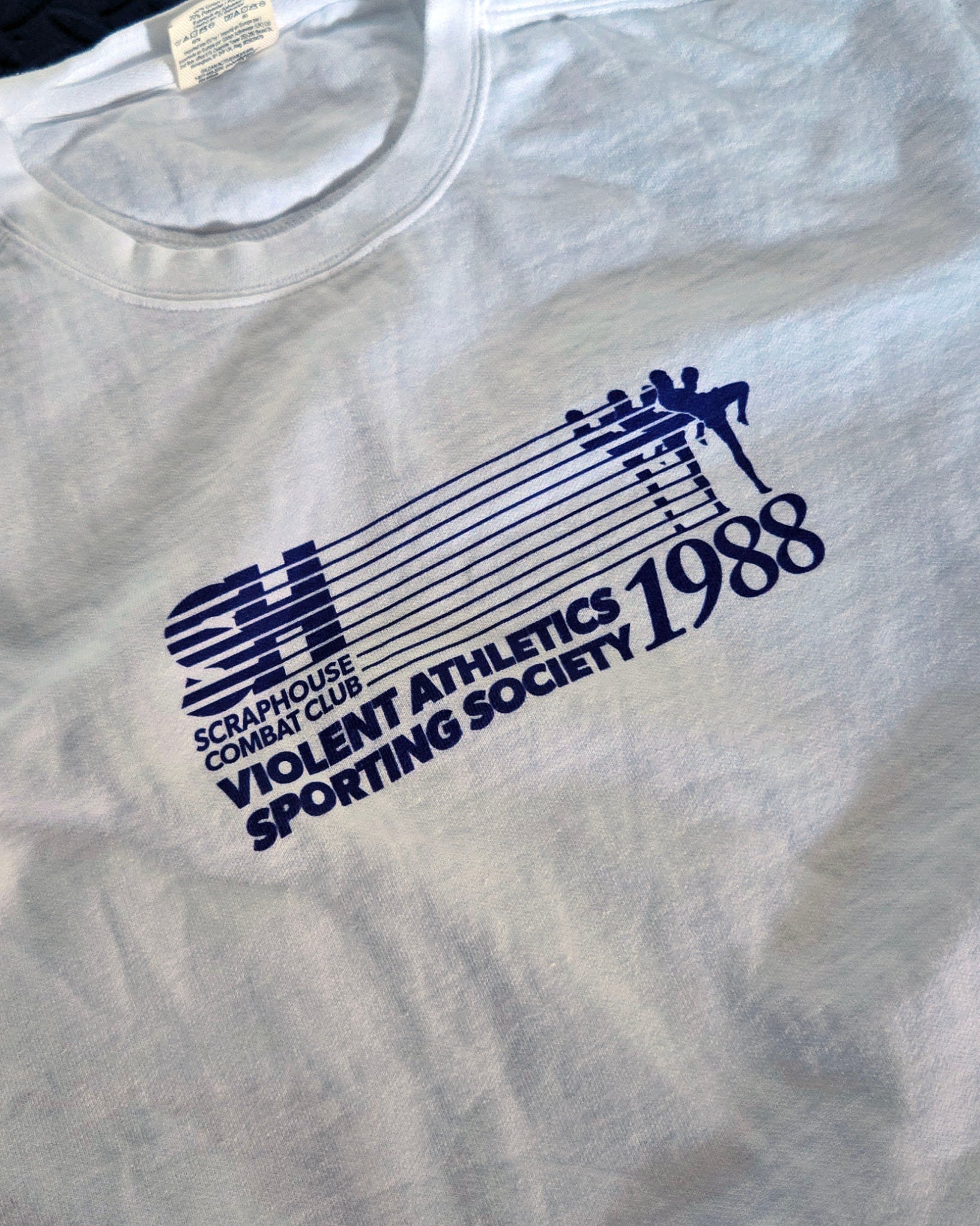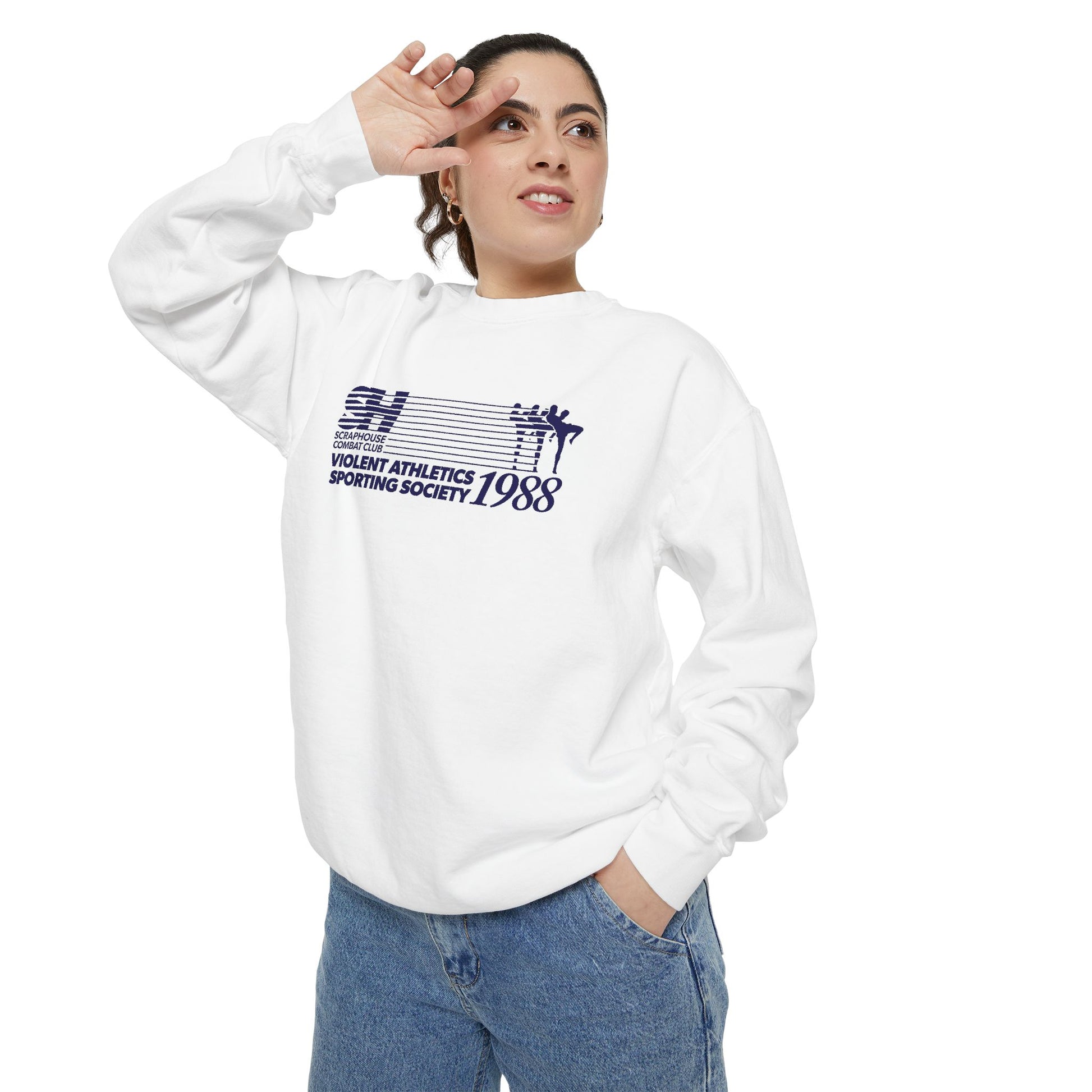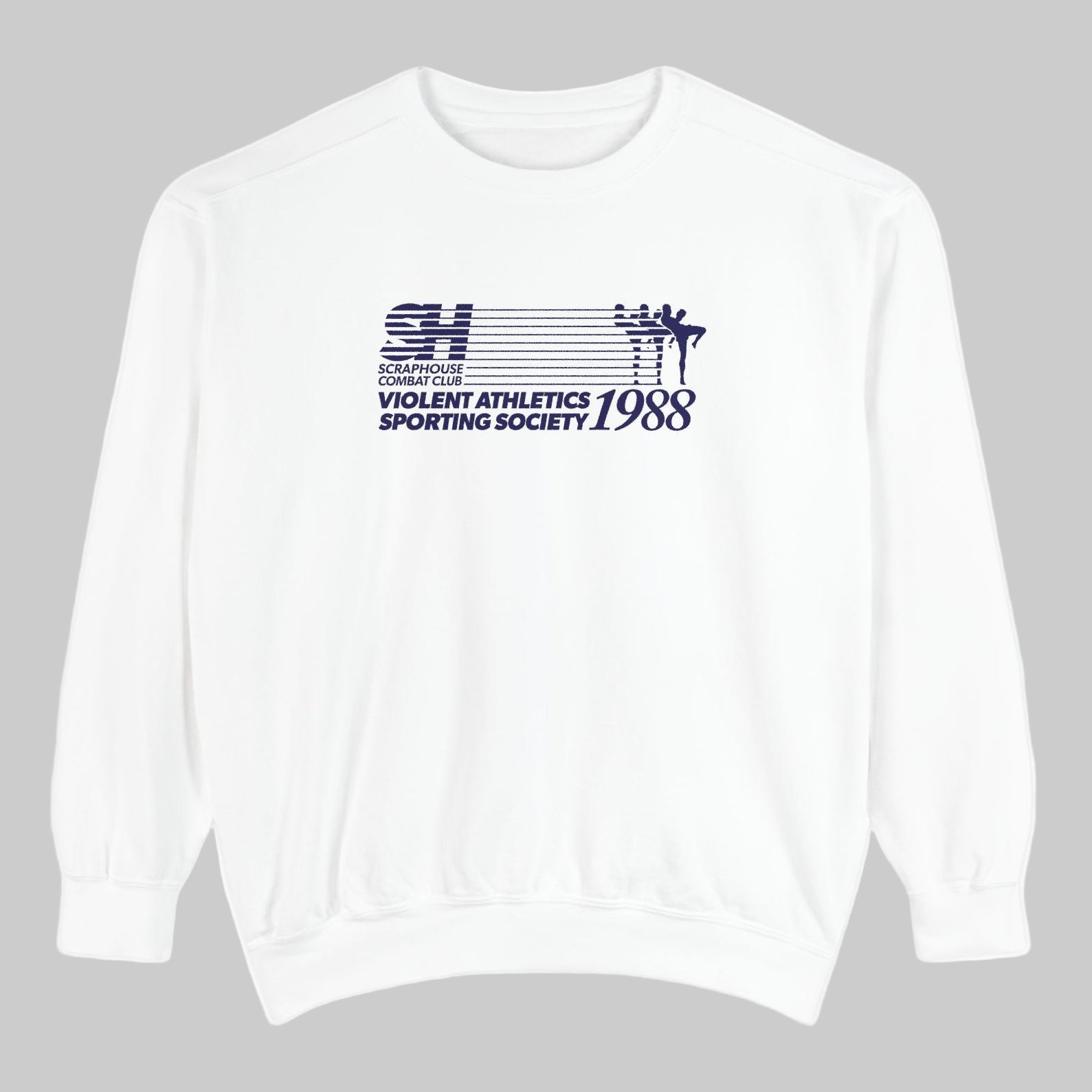 Violent Athletics Sporting Society - Navy print on medium-heavy White sweatshirt.